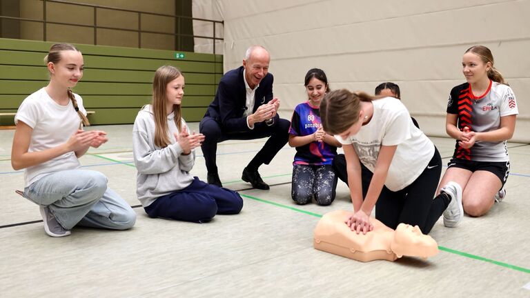 Bildungsminister Armin Schwarz, der Präsident der Björn Steiger Stiftung, Pierre-Enric Steiger, und der Geschäftsführer der Herzstiftung, Martin Vestweber, haben gemeinsam mit Jugendlichen aus siebten Klassen der Freiherr-vom-Stein-Schule in Eppstein die zuvor theoretisch erlernten Fähigkeiten an Reanimationspuppen angewandt. „Schnelles Handeln kann Leben retten – das gilt besonders in Notfällen. Umso wichtiger ist es, dass junge Menschen frühzeitig lernen, in kritischen Situationen besonnen und entschlossen zu reagieren. Der Wiederbelebungsunterricht, den wir im vergangenen Jahr eingeführt haben, ist inzwischen fest in unseren weiterführenden Schulen verankert. Er vermittelt nicht nur medizinisches Grundwissen und praktische Fähigkeiten, sondern stärkt auch Verantwortungsbewusstsein, Zivilcourage und den Mut, im Ernstfall zu helfen“, erläuterte Schwarz.
